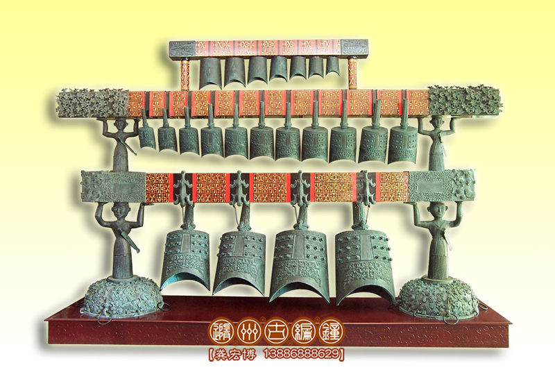 22件A型曾侯乙青銅編鐘演奏型,是我公司董事長、工藝美術(shù)大師王蒲琴女士根據(jù)曾侯乙編鐘設(shè)計(jì)制作,編鐘外形按照聞名世界的曾侯乙編鐘設(shè)計(jì)制作,編鐘及佩劍武士為青銅鑄造,采用國際標(biāo)準(zhǔn)樂音音高A=440Hz調(diào)音,音域五個八度,可以旋宮轉(zhuǎn)調(diào)演奏古今中外樂曲,編鐘大梁采用優(yōu)質(zhì)松木制作,表面噴漆,彩繪花紋;另配有保管編鐘用的木箱,便于運(yùn)輸和儲存。